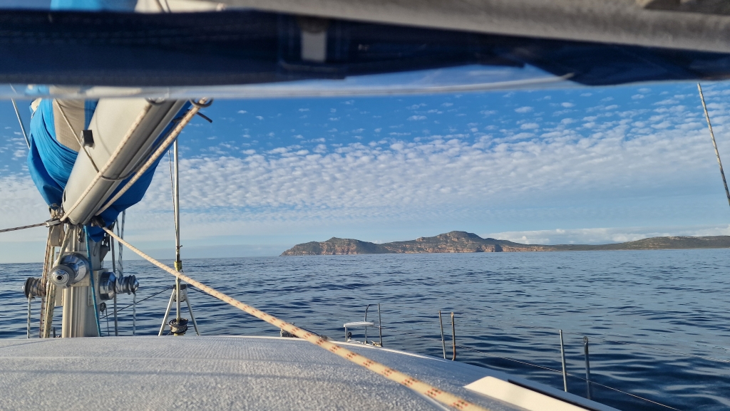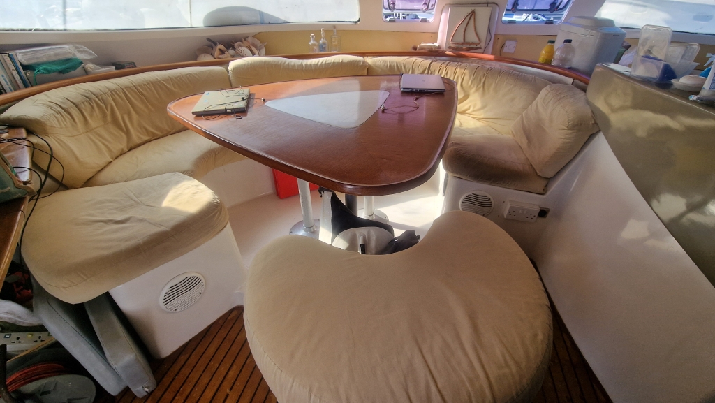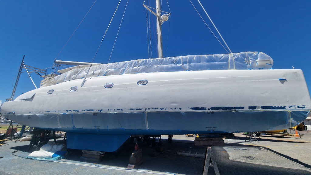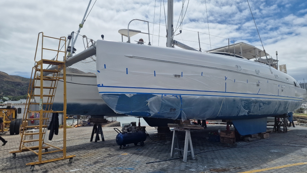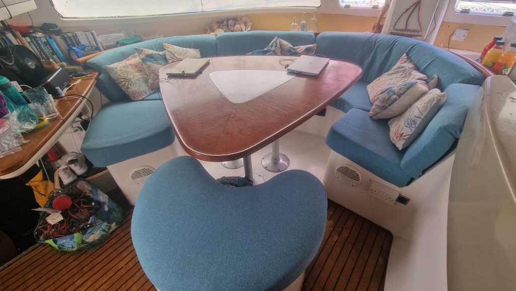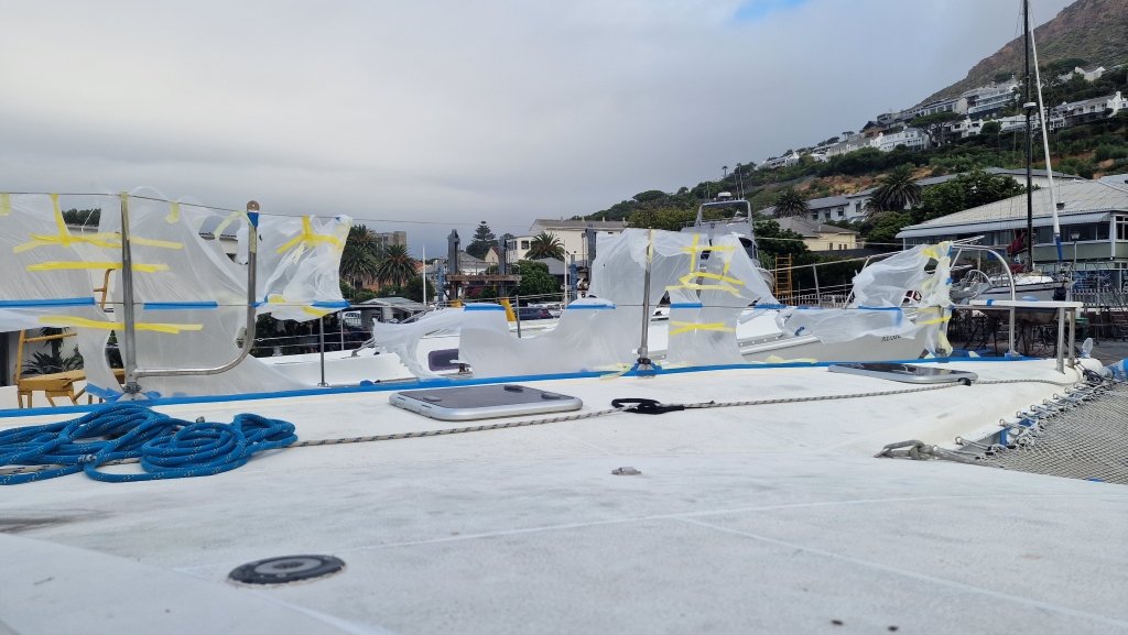 Overnight into the 9th, the wind became horribly strong and by morning much of the plastic sheeting was in tatters as the rain and then thunder started. It was the most rain Ally and Shawn have seen in the Western Cape so far and it continued all day so it was rather an unproductive time. On the 10th, the weather had settled a bit so Saliem arrived to resand and reapply the sheeting with help from Shawn. He left earlier than usual saying he would continue spraying the following morning. Ally deep cleaned the starboard forward cabin and Shawn spent much of the day researching and planning the route through the Caribbean through 2026/27. The 11th started drizzly wet as Simons Town was shrouded in thick mist but the sun managed to burn through by late morning when Saliem showed up to continue spraying – it’s been slower progress than everyone thought due to the notorious winds here. Late afternoon, the newly made saloon seating was delivered and the new colour gave the whole area an immediate facelift, however the workmanship was not all that great and not quite what Ally wanted, but they are more comfortable at least..