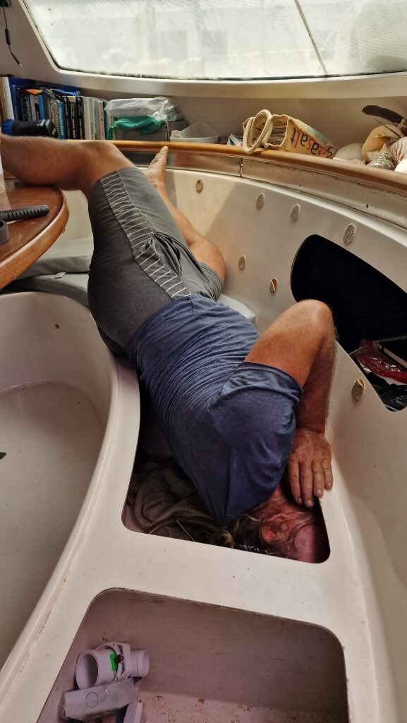 With it being a Sunday on the 1st, there were no workers around in the boatyard and it was a quieter day for Ally and Shawn, although Shawn ( with a little bit of help from Ally) did sand, fill and sand again the area that had been exposed when the bumper strip was removed from the outside of the starboard hull a couple of days ago. It was taken off as water was seeping in through the screws holes where the sealant had come away, so they were well and truly “glooped” up just before putting the strip back in place. Monday 2nd, Saliem was back to continue sanding the hulls and the newly welded fresh water tank was finally done by lunchtime rather than the day before as had been the original plan. The rest of the day was spent fighting it back into it’s tight space in the port side forward cabin and then plumbing it in…sounds easy, but the ridiculously tight spaces made it an almost impossible task to line all the pipes up to re-join them and having tried to resolve one leak after the other on trial fillings, at the end of the day it was discovered that the washer on the main outlet was damaged. Both Ally and Shawn were feeling positive that the 3rd was going to be a productive day and the first job on the list was to replace the washer having been to the hardware store for a replacement first thing. It meant moving the tank around again, which then put everything out of alignment…again, and it turned out to be an exceedingly frustrating day with leaks appearing in a different place at every attempt to refill having put everything back together time after time after time. The entire day was spent trying to sort it out and by late afternoon, it seemed that they had finally done it. They were both so shattered, they went out for fish and chips after clearing up and showering. On the morning of the 4th, Shawn rebuilt the wardrobe and put the panelling back up in the cabin where the water tank had been taken out and put back in and Ally went to start refilling the water tank a little so that they didn’t have to use the hose pipe anymore to wash up….and…..more leaks!! Aaaahhhhh! Another half day was spent taking out a length of inflexible hose and replacing it with a flexible one so that it was easier to work with. The ends of hoses had to be heated with a heat gun to make them soft enough to push onto connectors and then everything was circlipped into place and, hurrah….no more leaks! The tank was partially filled without any further issues.