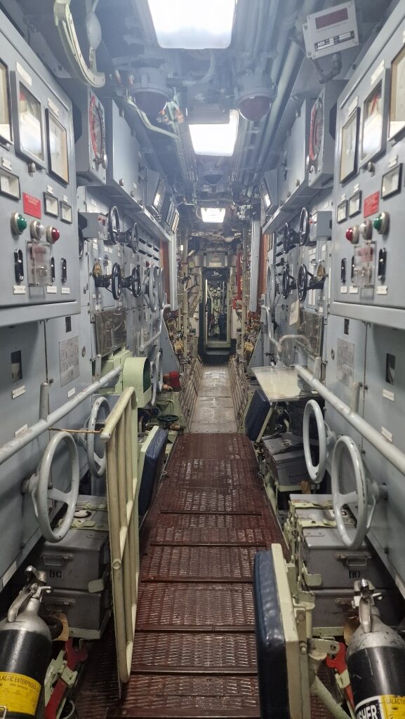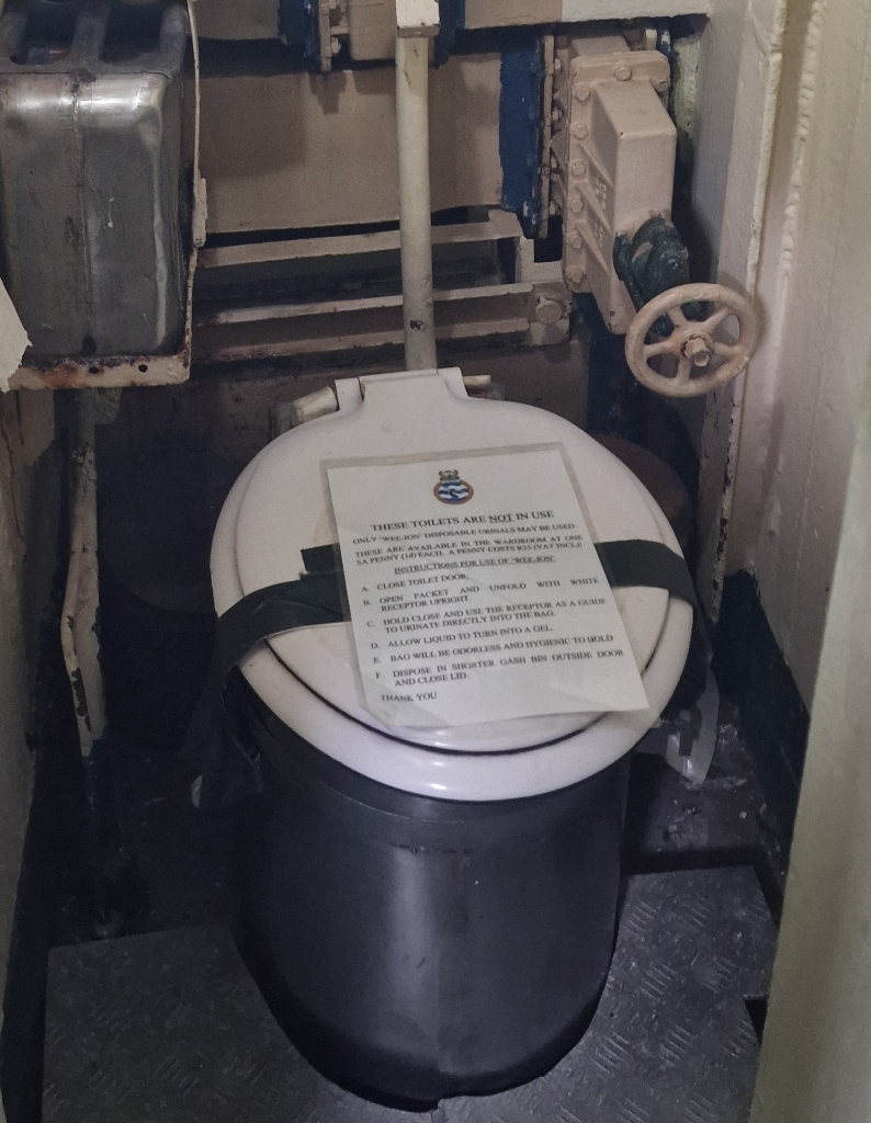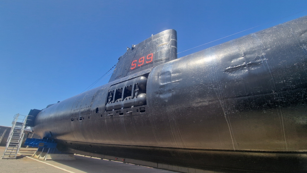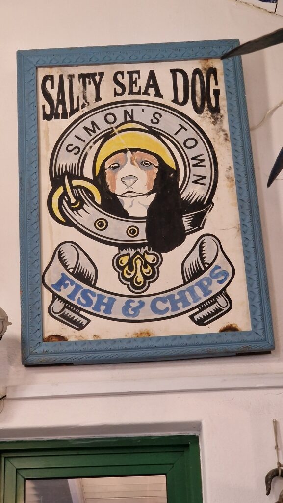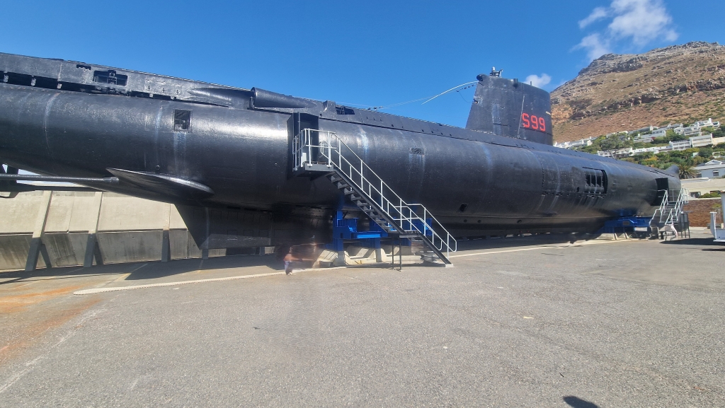 It was an easy start to Saturday 7th and first on the agenda was walking the short distance to the store for provisions and they couldn’t resist taking advantage of a coffee shop offering a scone and cappuccino for 59 rand ( just under £3!). They returned to Imagination to continue with cleaning and engines, but as per usual, it wasn’t to be straight forward and a gear cable had to be replaced which meant running a cable through behind the wardrobe in the starboard aft cabin followed by throttle tests to make sure all was well. The 8th was very windy and so the hull spraying was cancelled for the day, but it was Shawn’s birthday and after a relaxed first half of the morning going trough messages etc, he decided to do a final clean of both engine rooms while Ally did a deep clean in the starboard aft cabin. After a late lunch of bacon and egg sarnies, they then visited the Submarine Museum situated right next door to the marina. It’s a small place with various interesting objects, pictures and models on display and they also have a retired Daphné-class submarine out on the hard for visitors to see ( SAS Assegaai, formerly SAS Johanna van der Merwe). It has been modified to make entry and exit for tourists easier, but everything else remains “as it was” and the tour was excellent. The guide, Arne, was a retired Rear Admiral who had served on her a couple of times and his affection and knowledge of her was evident during the interesting and enthusiastic tour which was made even better by the telling of stories of life onboard. It’s incredible to think that up to 60 men would live and work in such a confined space for the 28 day tour, working 4 hours on, 8 hours off. With no real privacy for ablutions, and with very limited fresh water available showers were not regular, if taken at all. Eating, sleeping and trying to relax between shifts all went on in the same space. Ally was especially amazed by the galley – the size was similar to the galley on Imagination but more enclosed and the cook and his helper had to prepare and provide breakfast, lunch, 3 course dinners and clean up afterwards for all 60 men onboard over 2 sittings! Having spent much more time than they thought they would in the museum, they returned to Imagination for a short video chat with friends Andy and Jane in Carriacou, Grenada. Following that they went out for a very tasty dinner at nearby Bertha’s Restaurant where the staff were busy fending off baboons who had come to see what they could grab when they arrived.