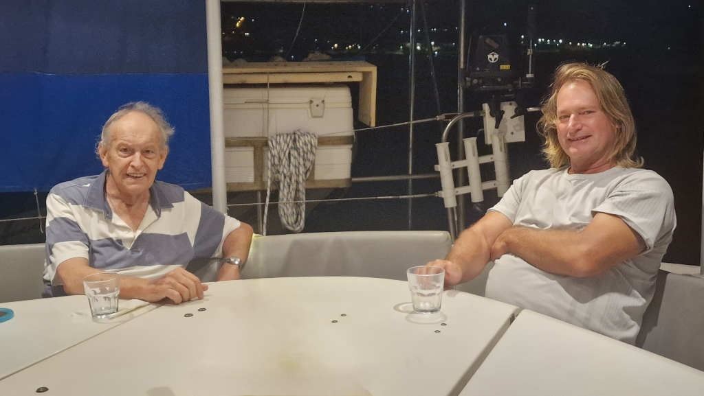 On the 5th, Ally and Shawn cleared the decks of the second dinghy, new mainsail, mainsail batons and jackstays so that Saliem would be able to start spray painting the hulls as soon as he was ready, but he didn’t turn up. He later messaged to say he was in the hospital being checked over as the ladder blew over onto his shoulder as he was getting ready to leave yesterday. He was ok, but had taken strong pain relief so asked if it was ok if he didn’t come until tomorrow so Shawn told him “no”, he must come immediately….joking!! Shawn got stuck into doing the rest of engine installations while Ally set to work deep cleaning the port forward cabin and port corridor. Imagination was fully wrapped in plastic by Saliem, who was feeling much more comfortable on the 6th, and late afternoon the undercoat was applied. Ally thoroughly cleaned the Saloon and then the port aft cabin and Shawn continued with engine installation. That evening, they decided to go across to the yacht club for a couple of drinks after dinner as it seemed pretty lively over there and within 10 minutes of being there, as one guy went to walk by he caught Shawn’s eye and they both looked at each other and recognised each other. He was one of the sailing instructors Shawn had when he was here in 2008 and the rest of the evening was spent in his company.