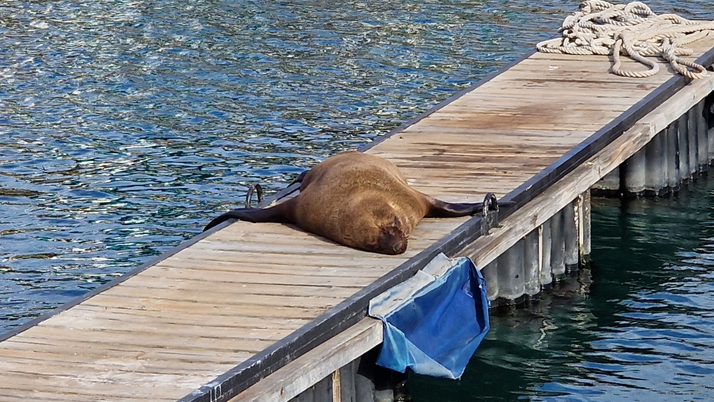Unfortunately, the leak in the starboard engine room was as bad as ever, with the bilge pump emptying it every 10 minutes, which was very frustrating as Shawn was struggling to figure out where it was coming from. On arrival to the yacht club, they were assisted to tie up by 3 willing marina staff who jumped off another yacht they were working on and ran around the dock to help. Ally and Shawn went to the office to “check in” and received a very warm and cheerful welcome from the office staff as well as a bottle of red wine – so unexpected and lovely. That evening, it became evident that some Cape Fur Seals ( a type of sea lion) use the docks as a resting place…and one of them in particular was huge and they can all get pretty vocal. They can be a little intimidating as people try to navigate around them particularly as they can have rabies!