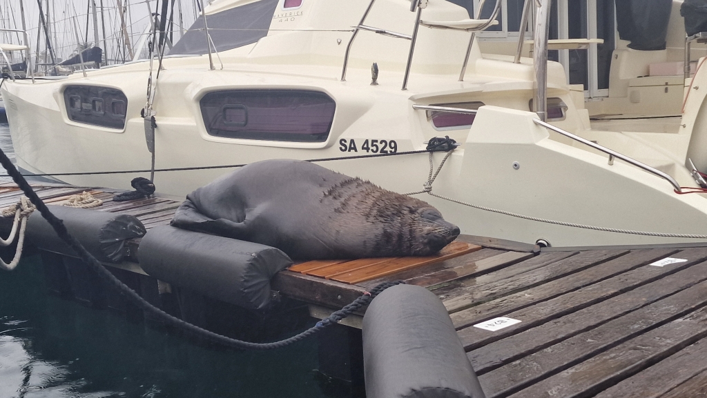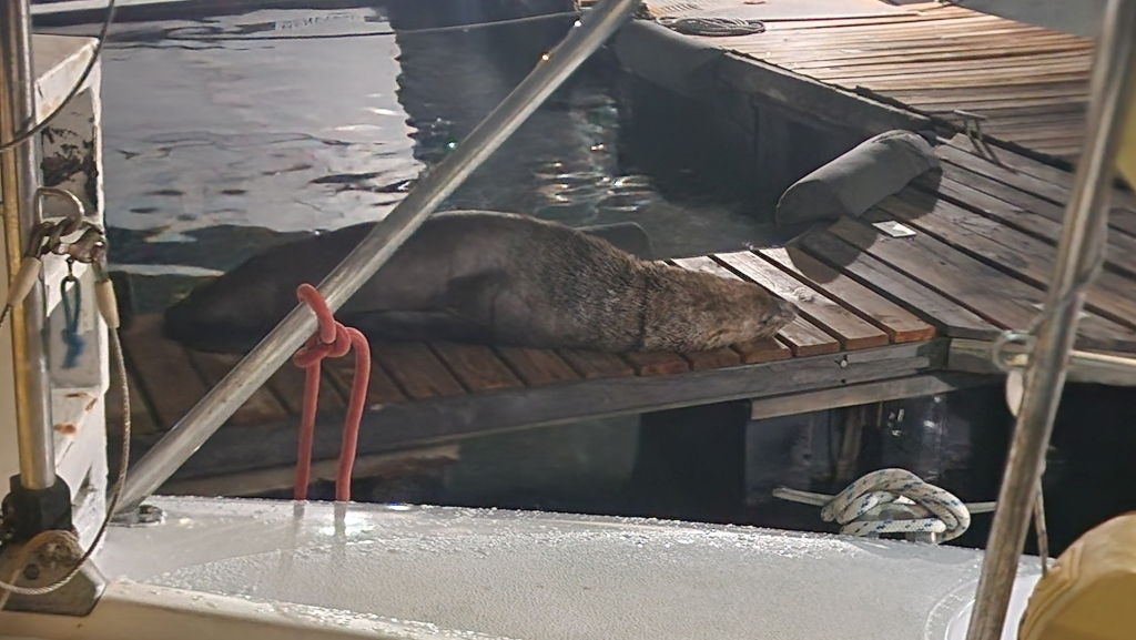 On the 28th, they headed into the V&A Waterfront in Cape Town after lunch, which in hindsight wasn’t the greatest thing to do while on a shopping mission…it was Saturday so absolutely heaving and the rain that came later in the day made their Uber ride back to the Yacht Club even longer than the ride in, with the congestion worsening as everyone tried to get home and avoid getting wet! That night, the massive seal/sea lion decided to use their pontoon to sleep on.